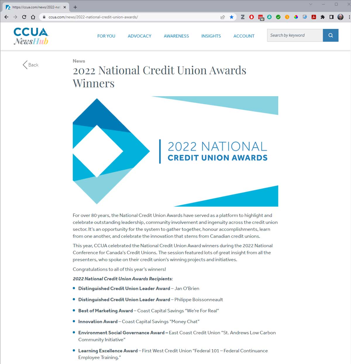 Learning Excellence Award for 2022, Canadian Credit Union Association (CCUA)